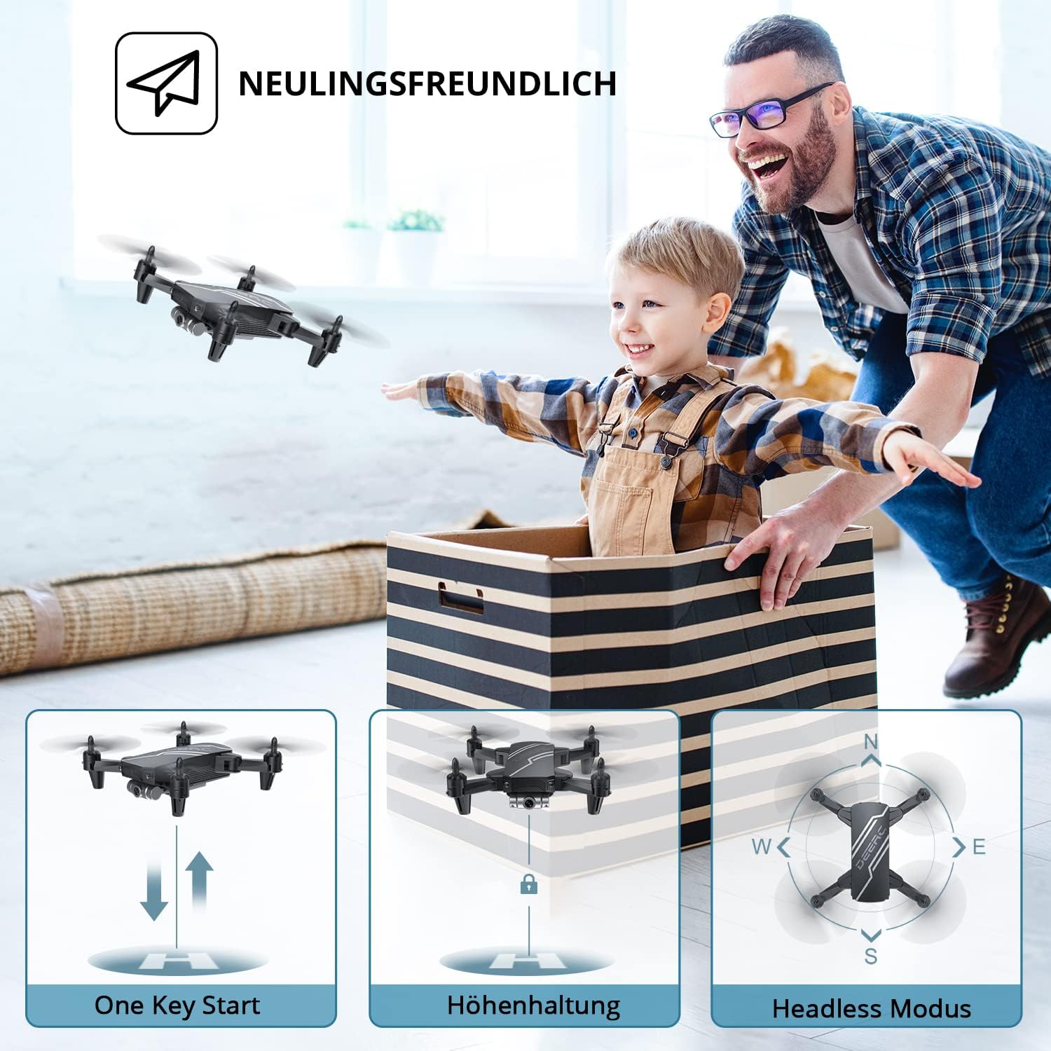 - Easy control: functions such as headless mode, emergency stop, auto altitude hold, one-key start/landing make D20 user-friendly for children and beginners. A perfect gift for friends and the little ones to make the dream of flying come true!