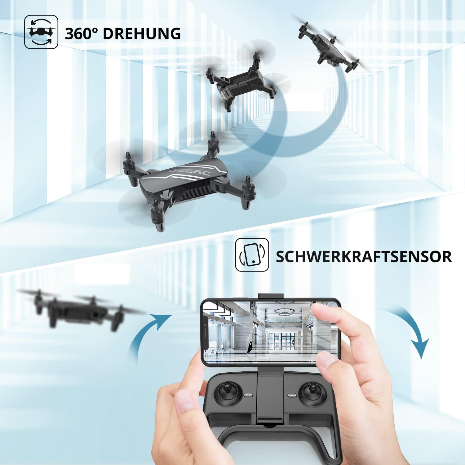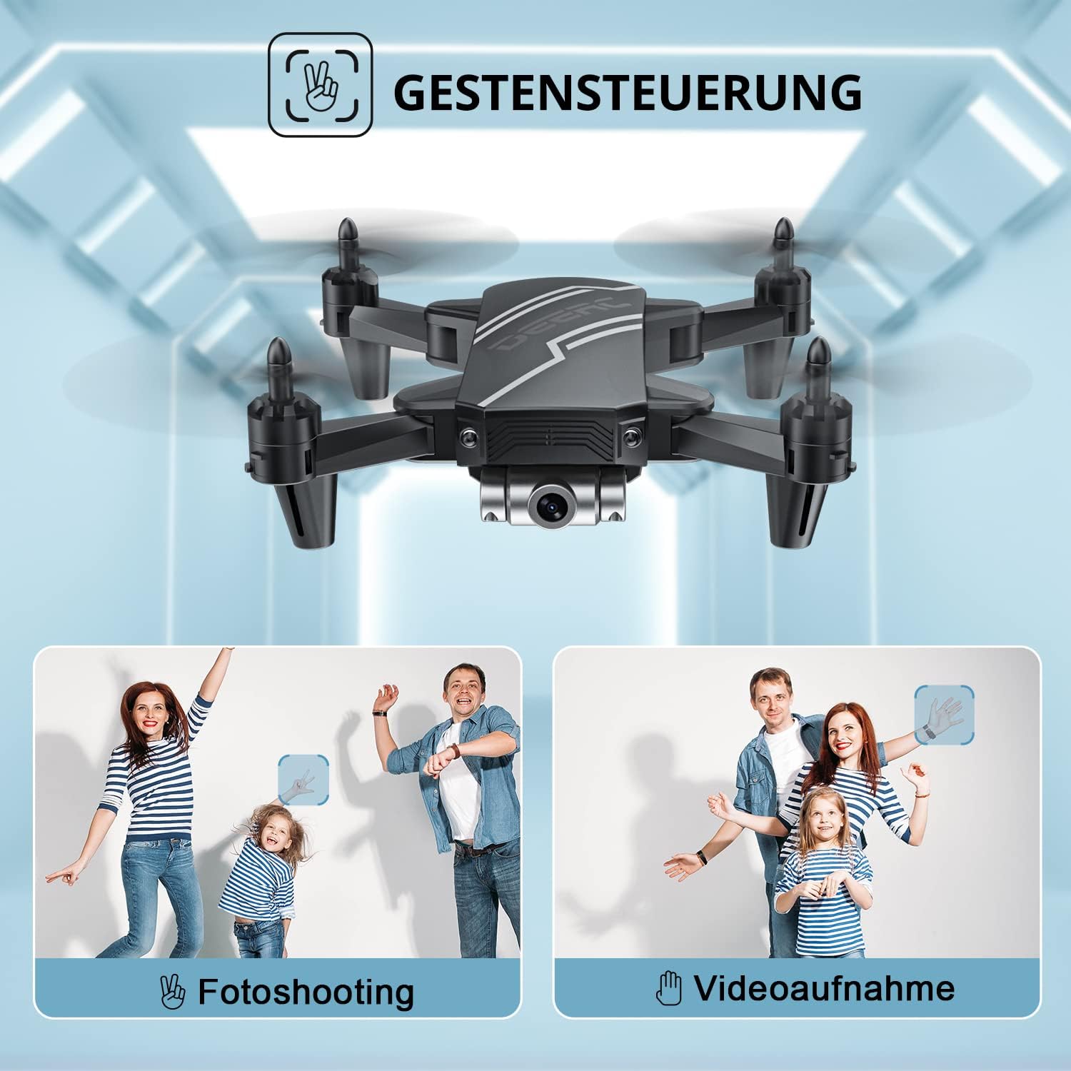 - More playing options: the foldable mini drone can be easily controlled via the app via the mobile phone. The intelligent voice and gesture control, trajectory, 360° flip and gravity sensor etc. can be activated via app. A smarter operations