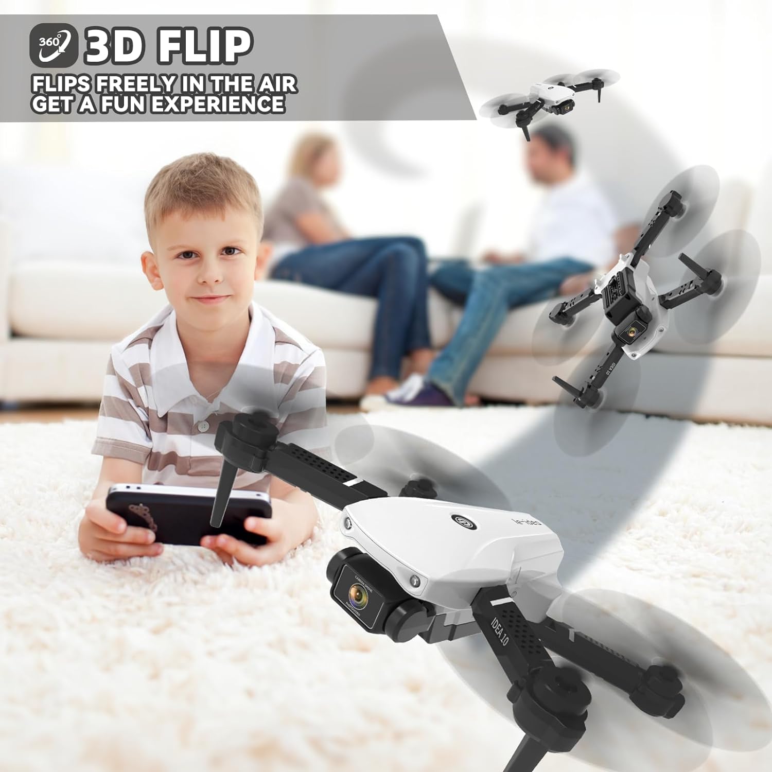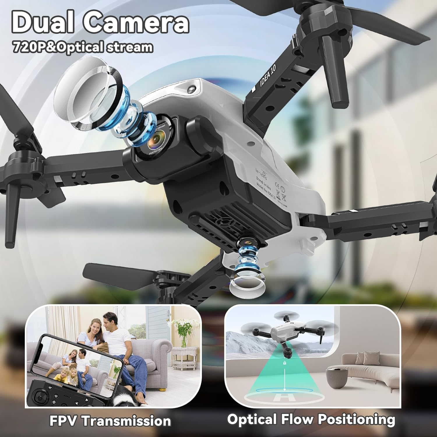 - Mini drone with multiple cameras: With a tiny, lightweight and flexible design, this drone can not only fly freely in tight spaces, it also has 2 cameras for real-time image transmission. With its 720p HD camera and bottom camera, you can change your view in the air at different angles.